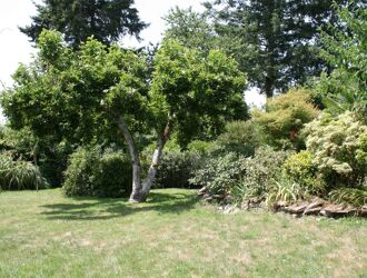 Terrain de 1 200 m² clos de mur, sans vis à vis, avec superbe terrasse en bois orientée plein sud, autre terrasse ombragée, garage récent en bois et abri de jardin.