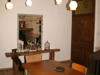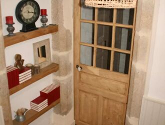 Maison lumineuse et agréable, comprenant au rez-de-chaussée, séjour avec poêle à bois, pierres et poutres apparentes, cuisine aménagée et équipée, petit salon très agréable, placard buanderie, toilettes et débarras.