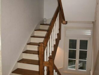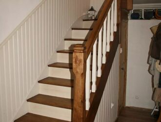 Au 1er étage, grande mezzanine avec couloir, deux chambres, salle d'eau-wc.